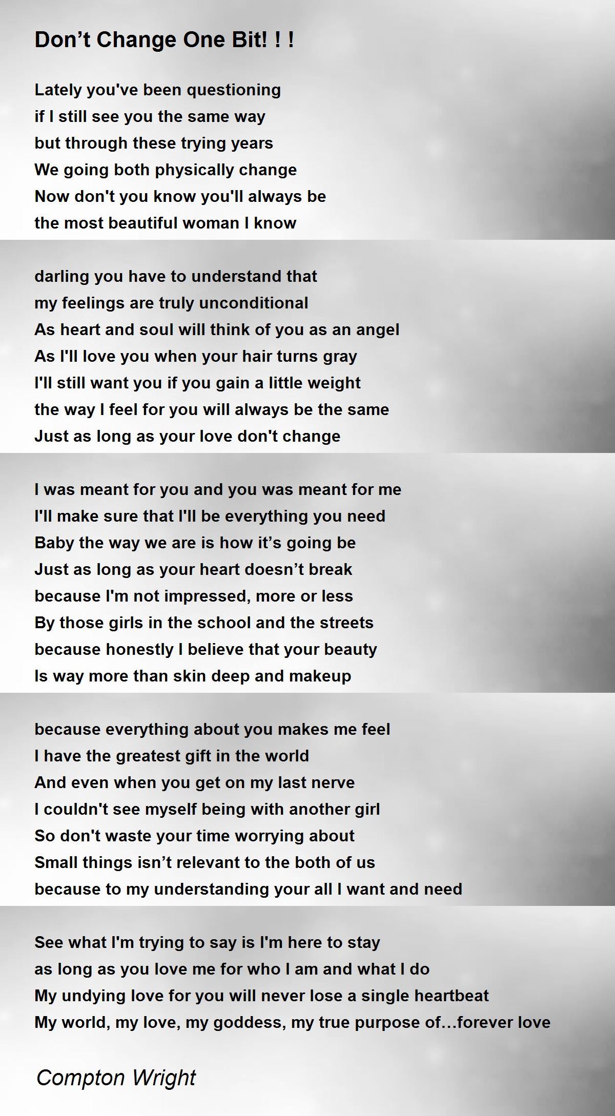chorus see i'll love you when your hair turns gray i'll still want you if you gain a little weight the way i feel for you will always be the same just as long as your love don't change, no. See, i'll love you when your hair turns gray 'cause i'll still want you if you gain a little weight, yeah the way i feel for you will always be the same just as long as your love dontchange, no.